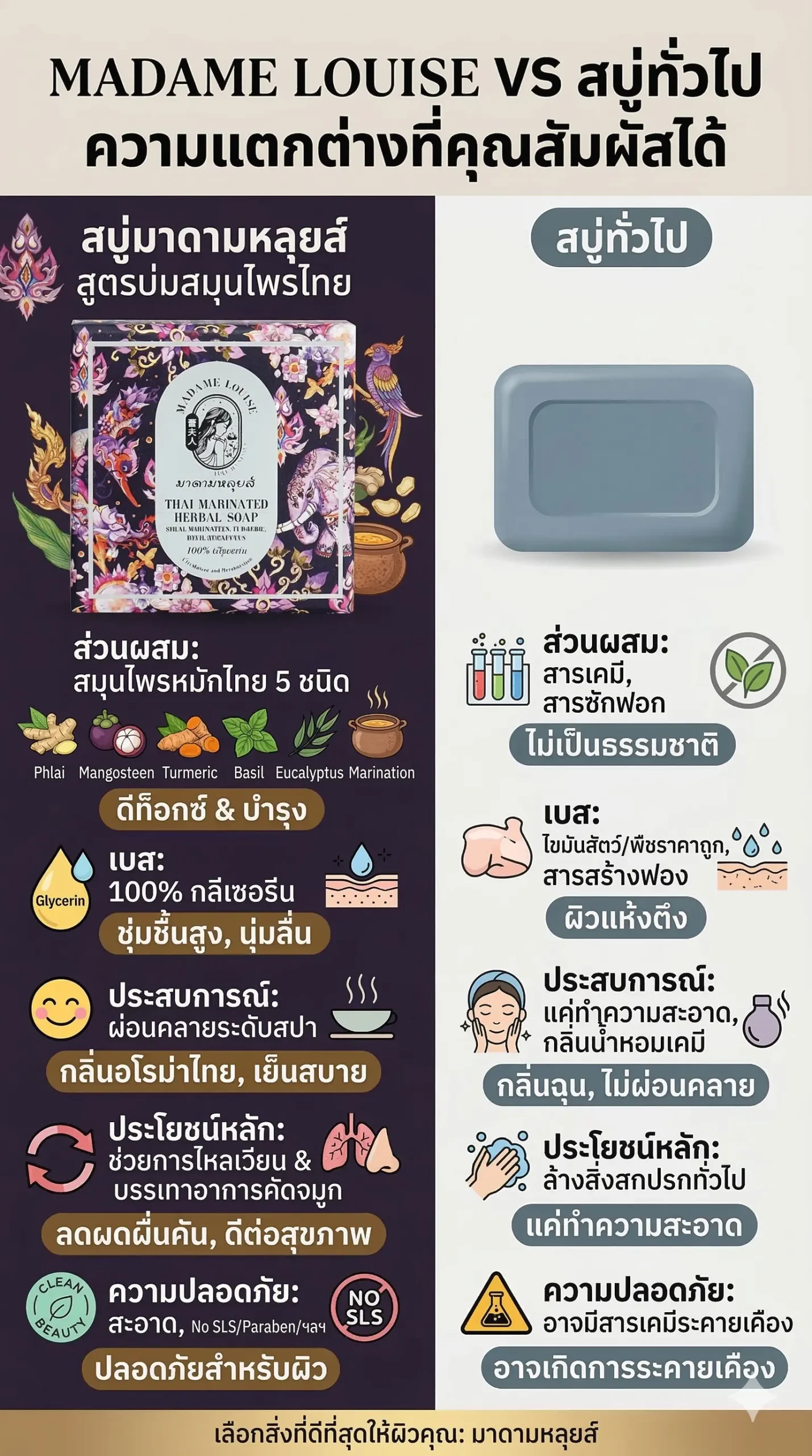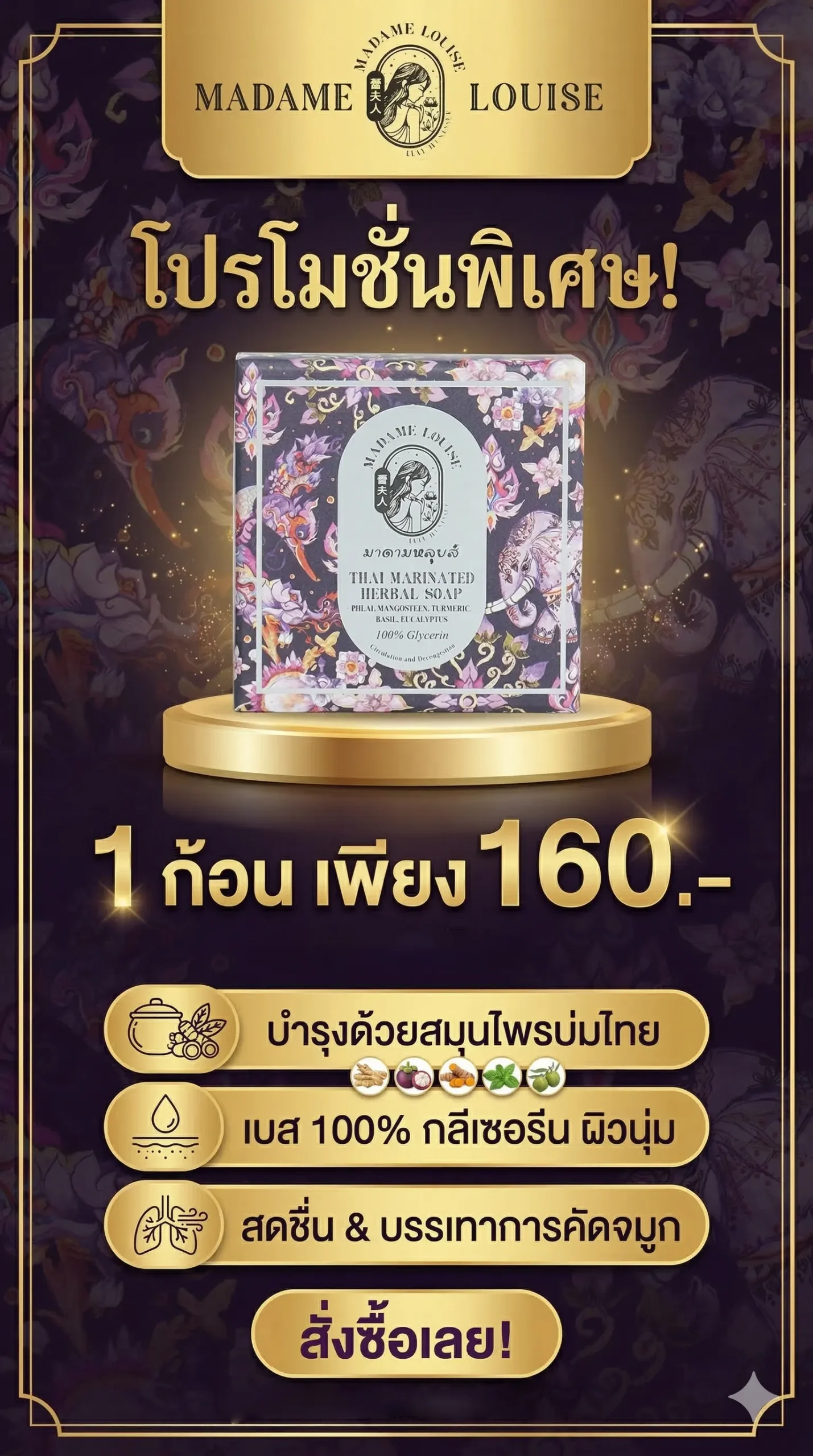 สบู่มาดามหลุยส์ สูตรบ่มสมุนไพรไทย (สีม่วง) สบู่กลีเซอรีนแท้ 100% ผสานสมุนไพร 11 ชนิด ทำความสะอาดพร้อมดีท็อกซ์ผิวในก้อนเดียว