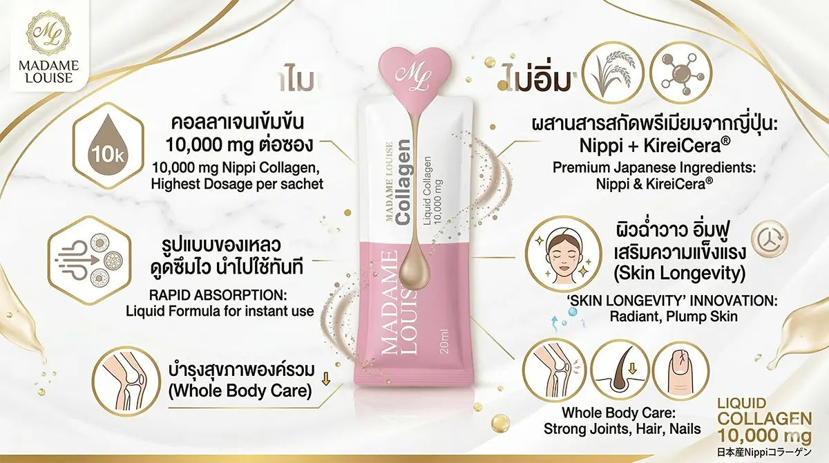 Madame Louise Liquid Collagen 10,000 mg ผสาน Nippi Collagen พรีเมียมจากญี่ปุ่น และ KireiCera® เซราไมด์จมูกข้าว คืนความฉ่ำวาว (Glass Skin) พร้อมบำรุงลึกแบบองค์รวม